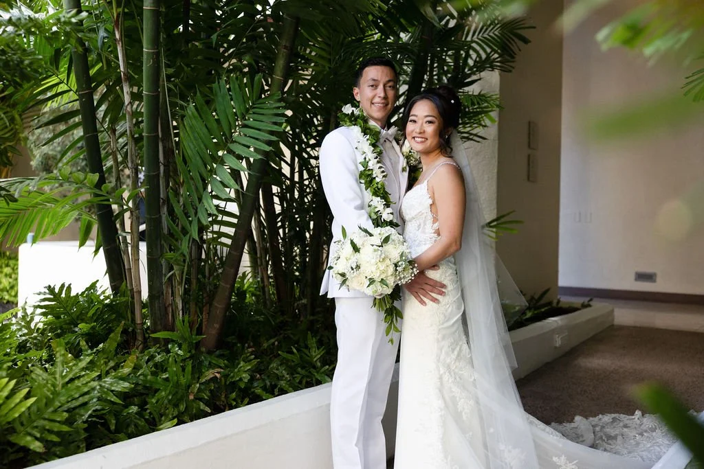 The couple began their special day getting ready in separate rooms of the resort, each surrounded by the elegant ambiance that Halekulani is known for! Alyssa was radiant in a white gown, her long flowing veil perfectly pinned into an elegant updo. She carried a beautiful hand-tied bouquet featuring white roses, carnations, and baby's breath, accented with lush greenery. Joshua complemented her look effortlessly in an all-white suit, his boutonniere matching the bride’s bouquet perfectly!