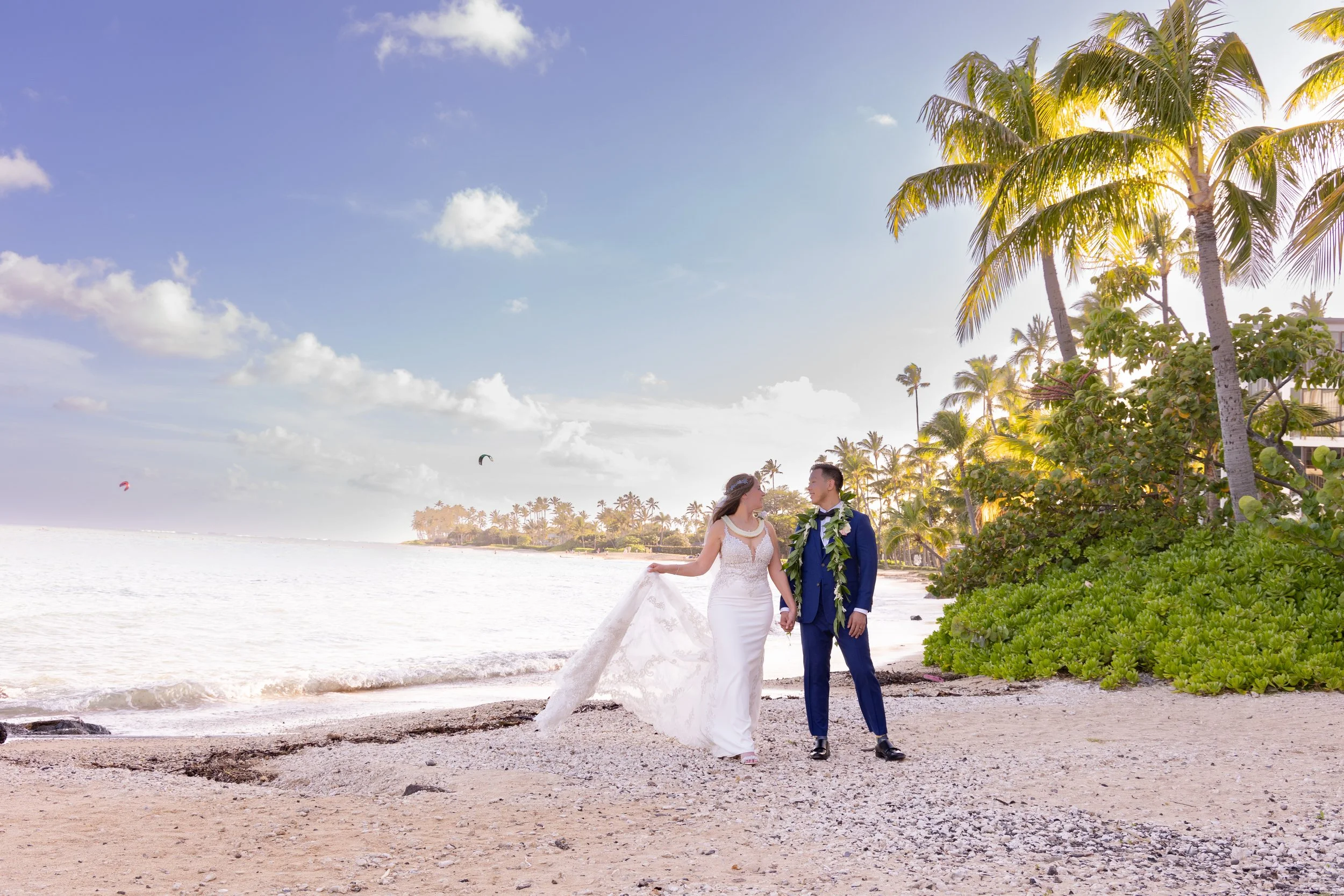 Nestled within the oceanfront grounds of the Kahala Resort, Chantal and Stephen exchanged their vows in an enchanting ceremony at the Plumeria Grove! The clear skies and gently swaying palm trees created the perfect backdrop for their union! Words of love and commitment floated on the breeze, witnessed by family and friends who gathered to celebrate this joyous occasion!