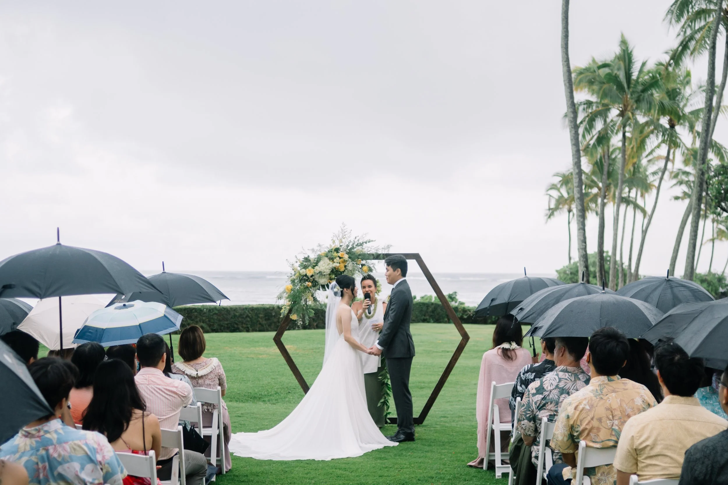 Though rain fell during the ceremony, it only added to the beauty of the moment. In Hawaiian culture, rain on your wedding day is considered a blessing—a symbol of cleansing and new beginnings. Under umbrellas, Diane and Sho exchanged personal vows in front of their family and friends, reflecting on their journey together and sweetly reminiscing about their first date!