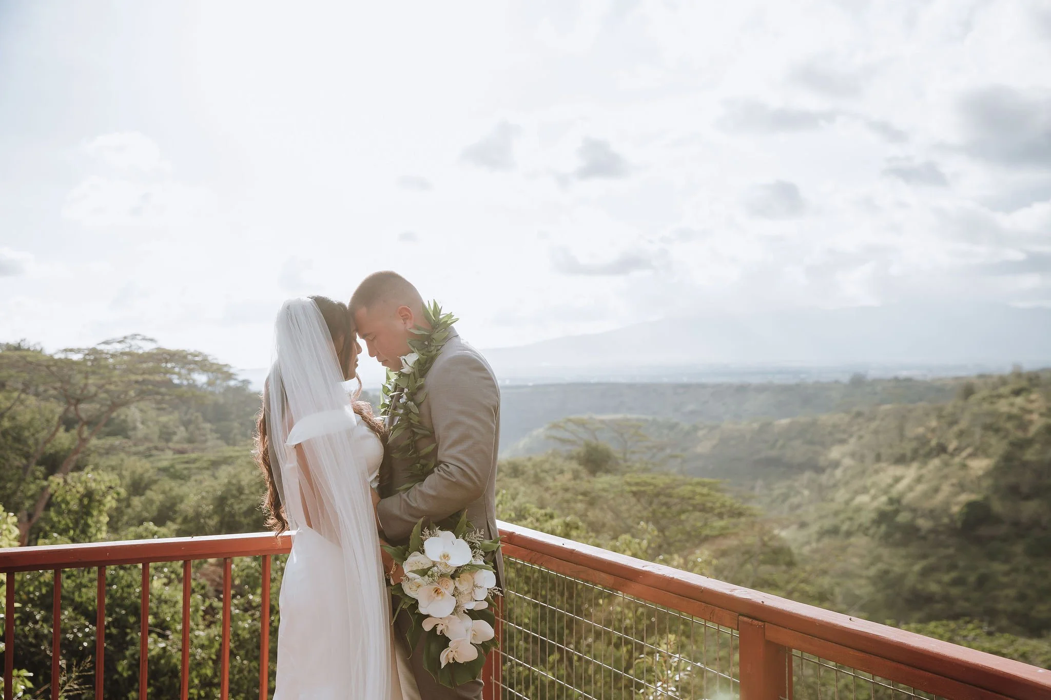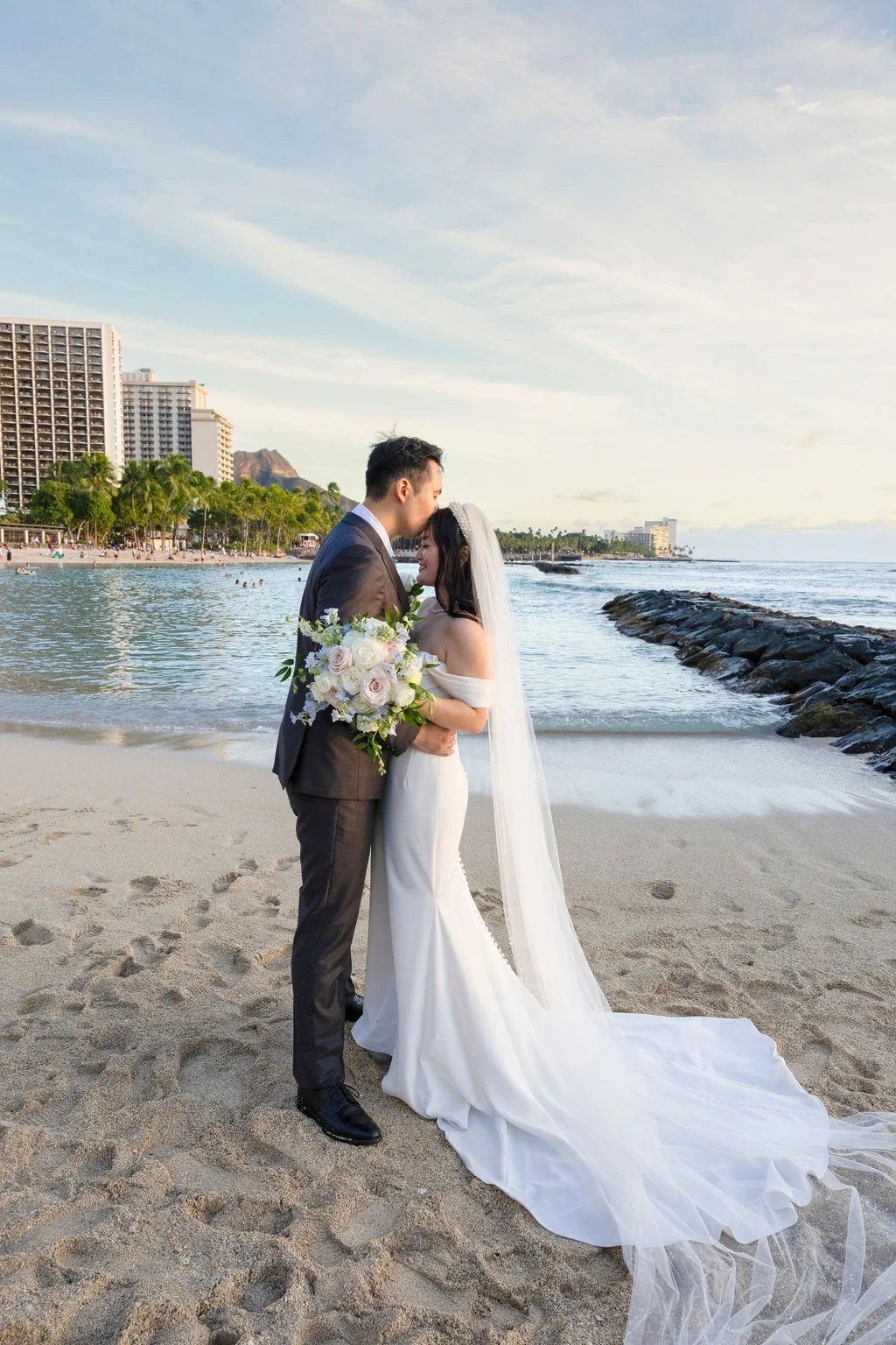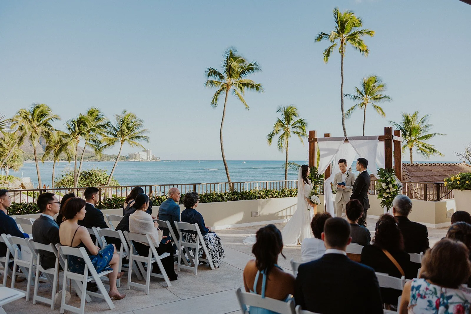 The couple began their special day getting ready in separate rooms of the resort, each surrounded by the elegant ambiance that Halekulani is known for! Alyssa was radiant in a white gown, her long flowing veil perfectly pinned into an elegant updo. She carried a beautiful hand-tied bouquet featuring white roses, carnations, and baby's breath, accented with lush greenery. Joshua complemented her look effortlessly in an all-white suit, his boutonniere matching the bride’s bouquet perfectly!