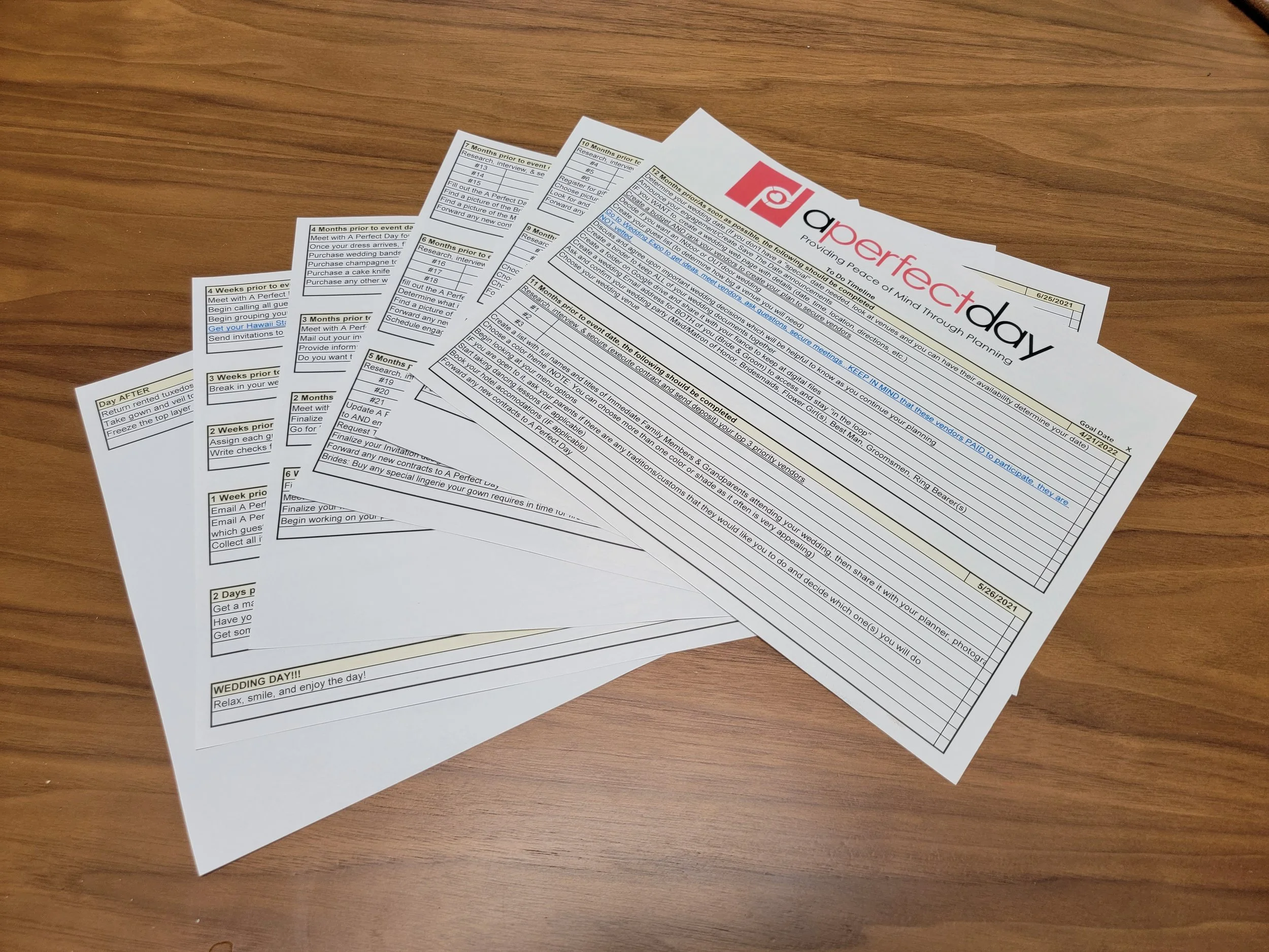 The Timeline is created by compiling vendor contracts, your visions & choices along with A Perfect Day’s signature checklists & forms. Each timeline is created by one of our expert coordinators, and specifically: outlined for easy readability, detailed to the minute complete with prep reminders, and segmented to easily assign specific tasks to family & friends. Our timeline is designed to keep you on schedule, avoiding penalties, awkward pauses, and unnecessary lags in your ceremony & reception. You will have phone numbers, item quantities, & specifics on hand in the event of questions or emergencies. You will be able to breathe easy with peace of mind through planning!